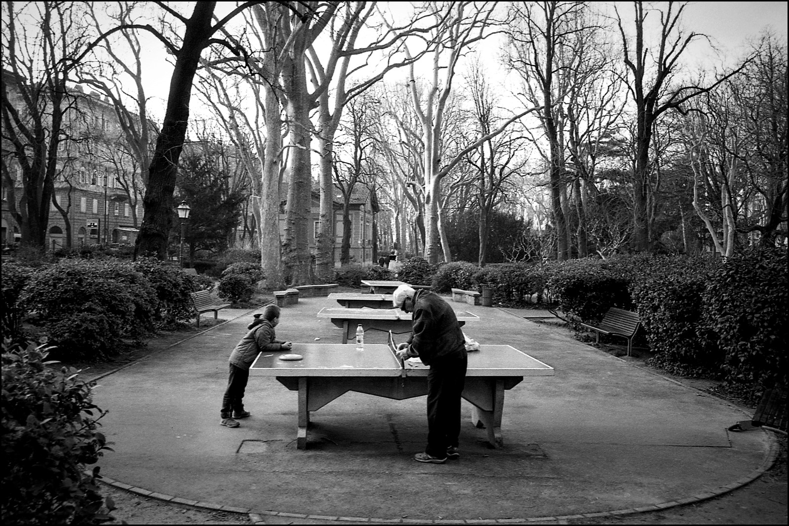 Il bianconero rende più intenso questo confronto con gli alberi spogli che incorniciano la scena e danno profondità.