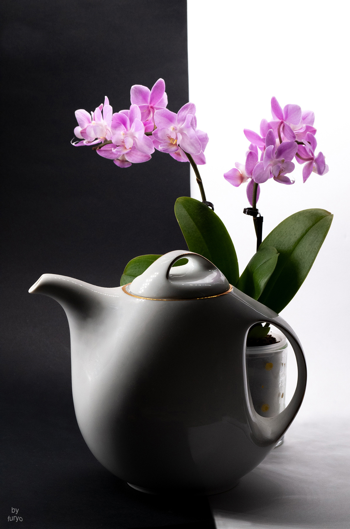 Io farei delle prove: metterei l'orchidea in un vaso contenitore (bianco?Nero? Verde?) e lo posizionerei più o meno vicino, più o meno davanti/dietro al bricco.
