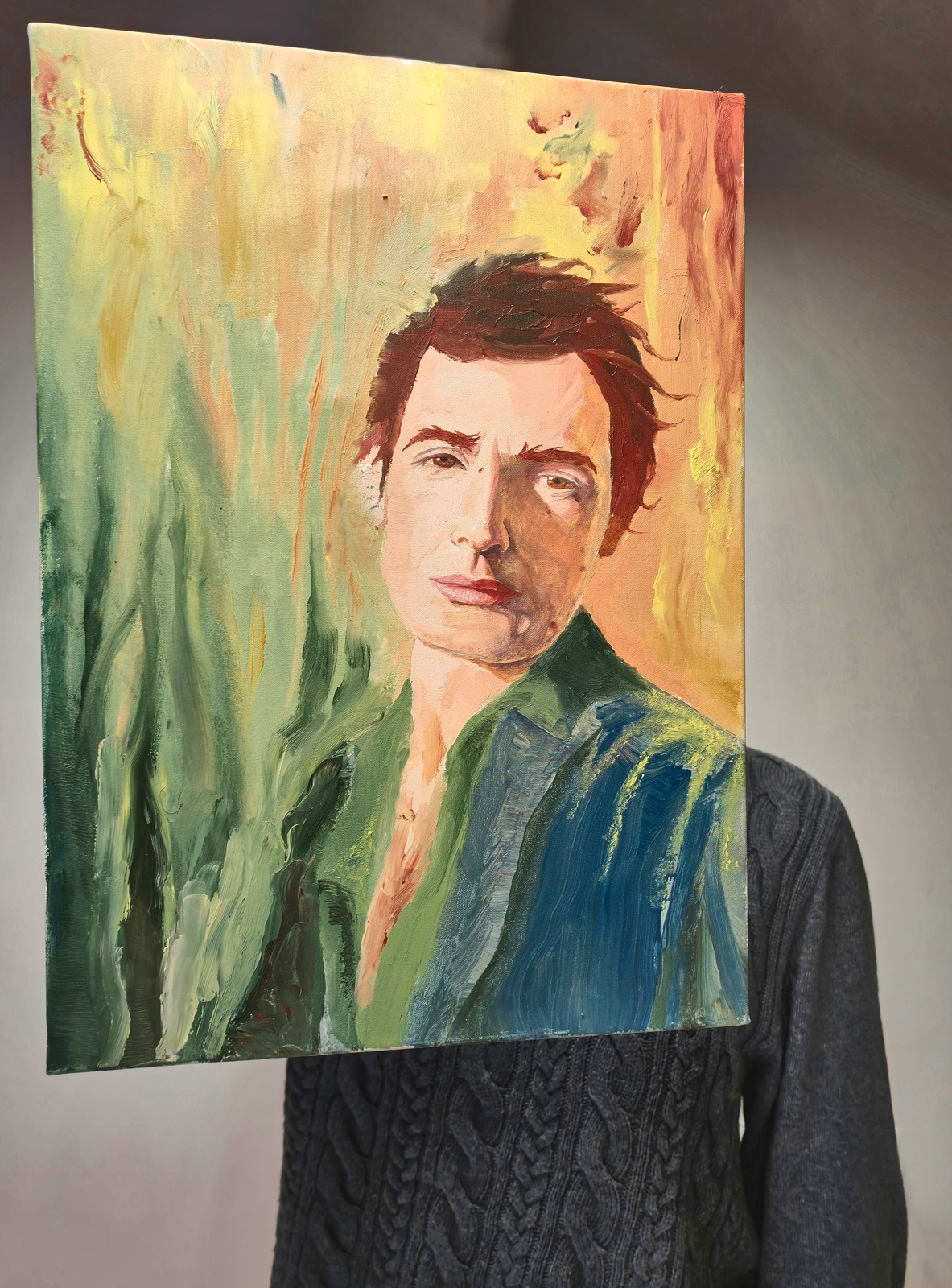 Il mio autoritratto ad olio ( che ho completato) due giorni fa fotografato mentre viene tenuto in mano da mia moglie!