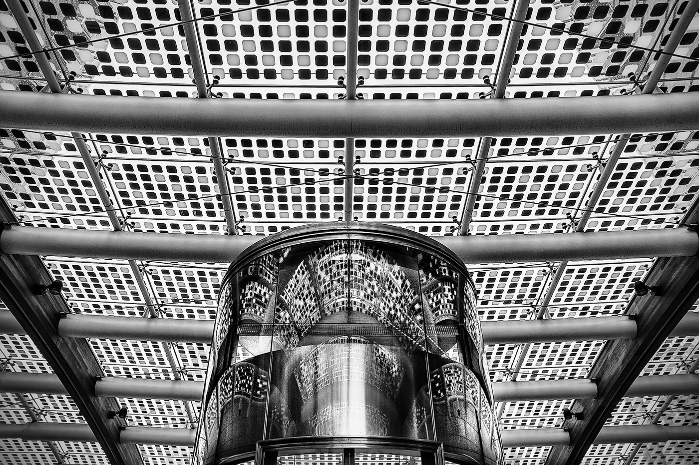 Ottimo bianco e nero, lucente e dettagliato, il pattern del soffitto che si riflette deformato sulla superfice curva da un che di fantascientifico all'immagine.