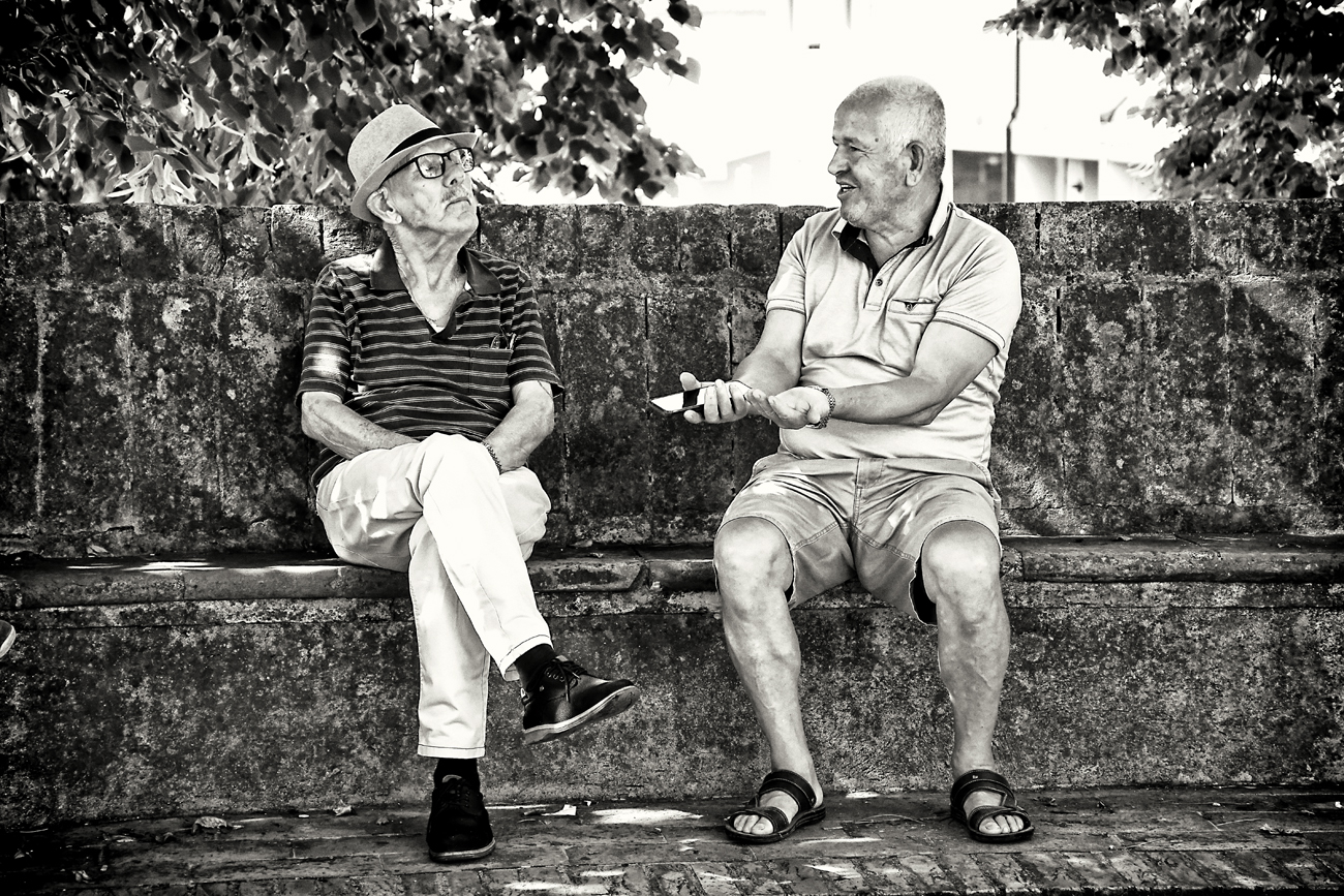 Mi sembra quasi di udire le loro parole. Ma qui è il linguaggio del corpo che accompagna le loro parole, il bianconero eliminando le distrazioni del colore è funzionale allo scatto.