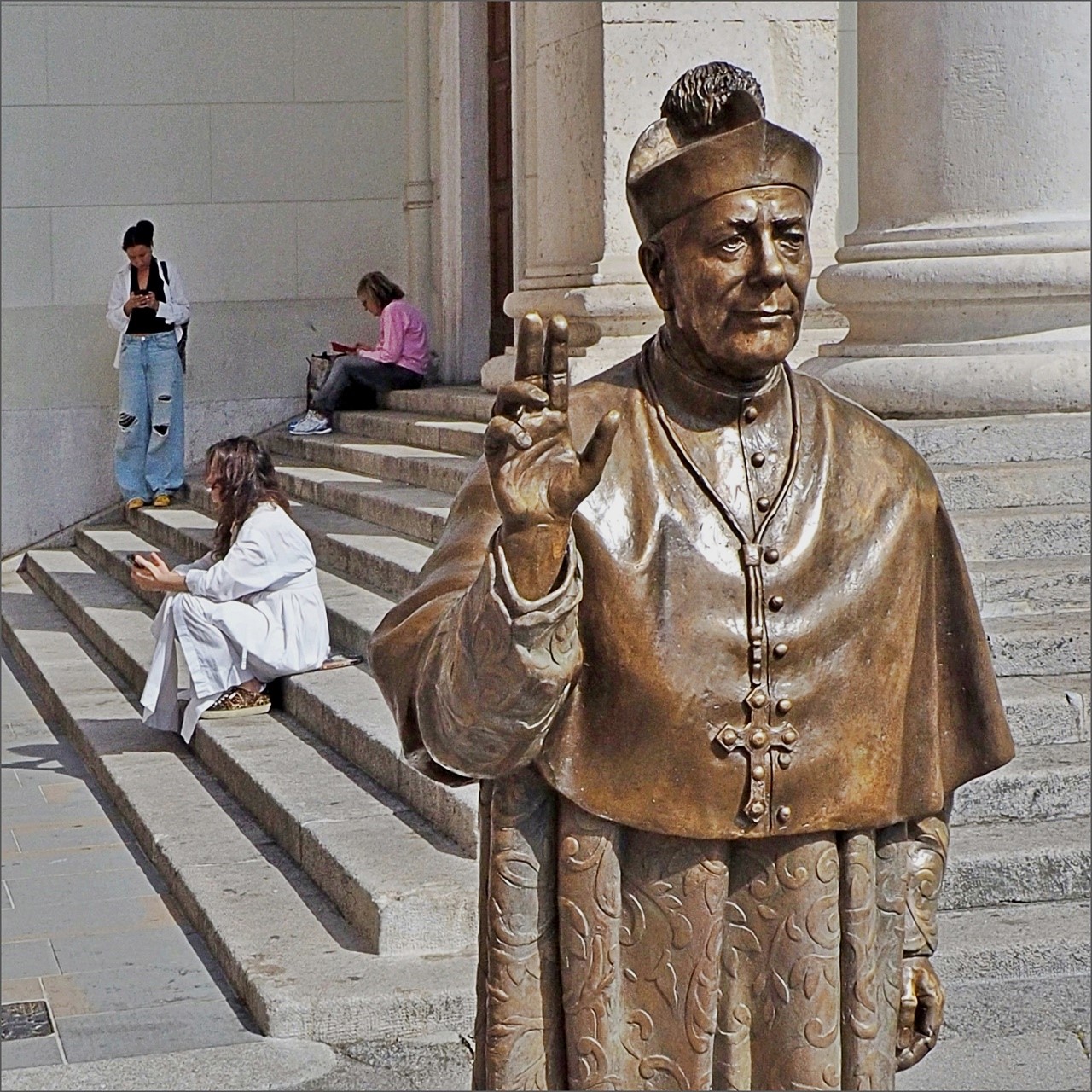 Sullo sfondo una scena comune, purtroppo. La statua in primo piano, dando le spalle, potrebbe dare l'impressione di dissociarsi.