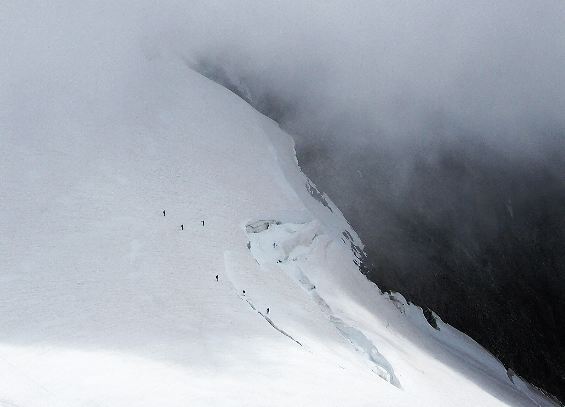 Le nuvole basse in alto, la luce in basso, i crepacci, i piccoli alpinisti, creano un ambiente suggestivo.