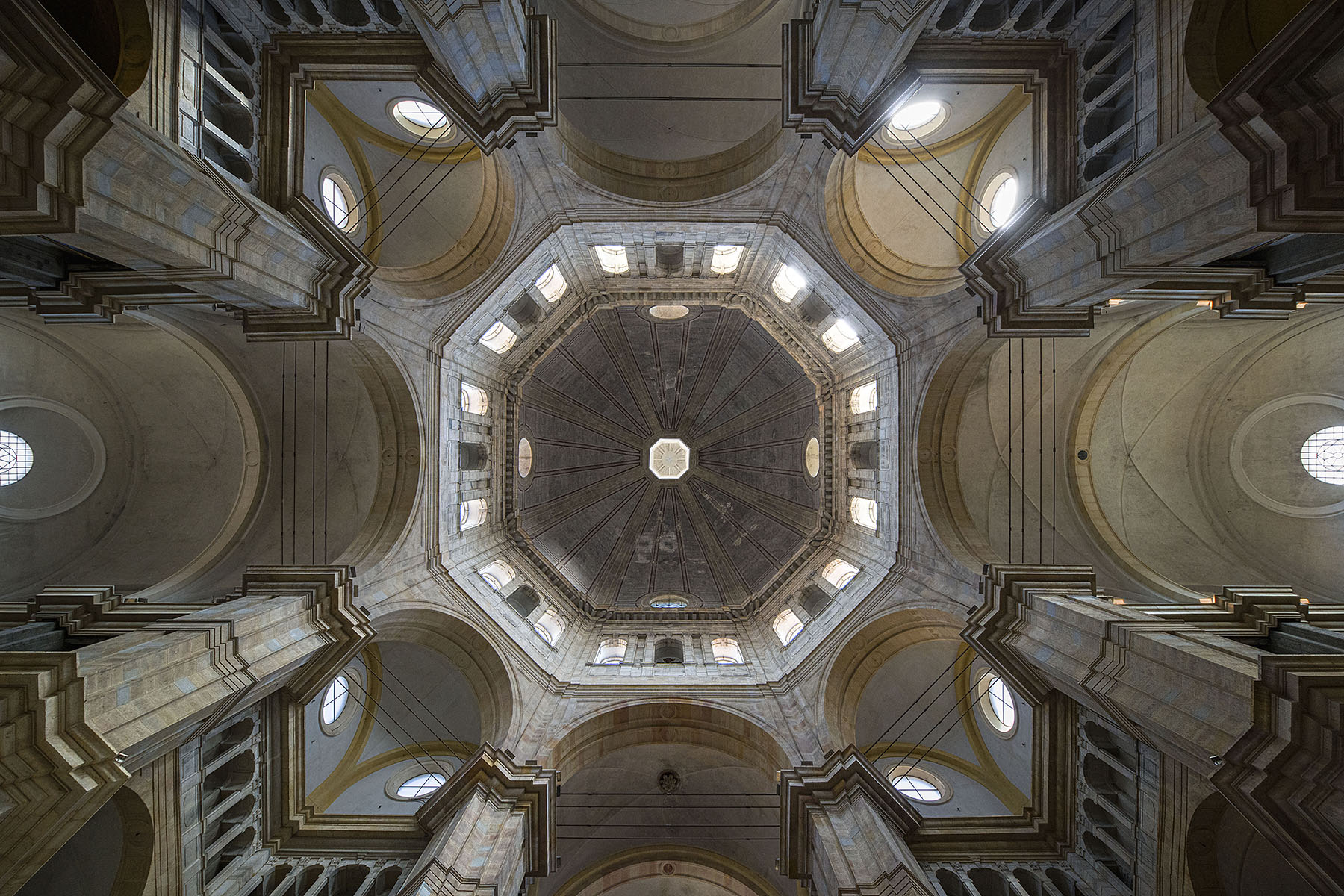 La luce che filtra da finestre circolari e ovali, distribuite in modo simmetrico, crea un gioco di chiaroscuro che scolpisce le superfici e accentua la profondità degli elementi strutturali. Ciao Gianni |