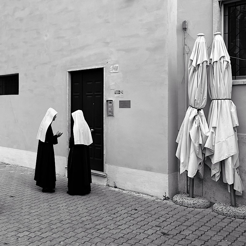 I due ombrelloni sembrano intenti in un conciliabolo in disparte, alle spalle delle suore.