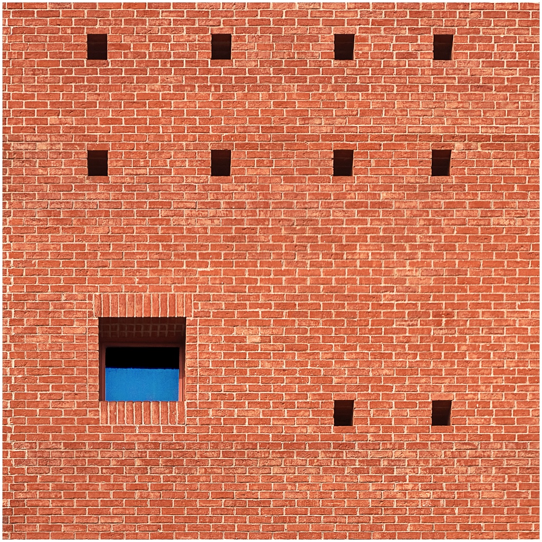 Uno scatto rigoroso, pulito, geometrico con la finestra blu che rompe la simmetria diventando il centro visivo dell'imagine.
