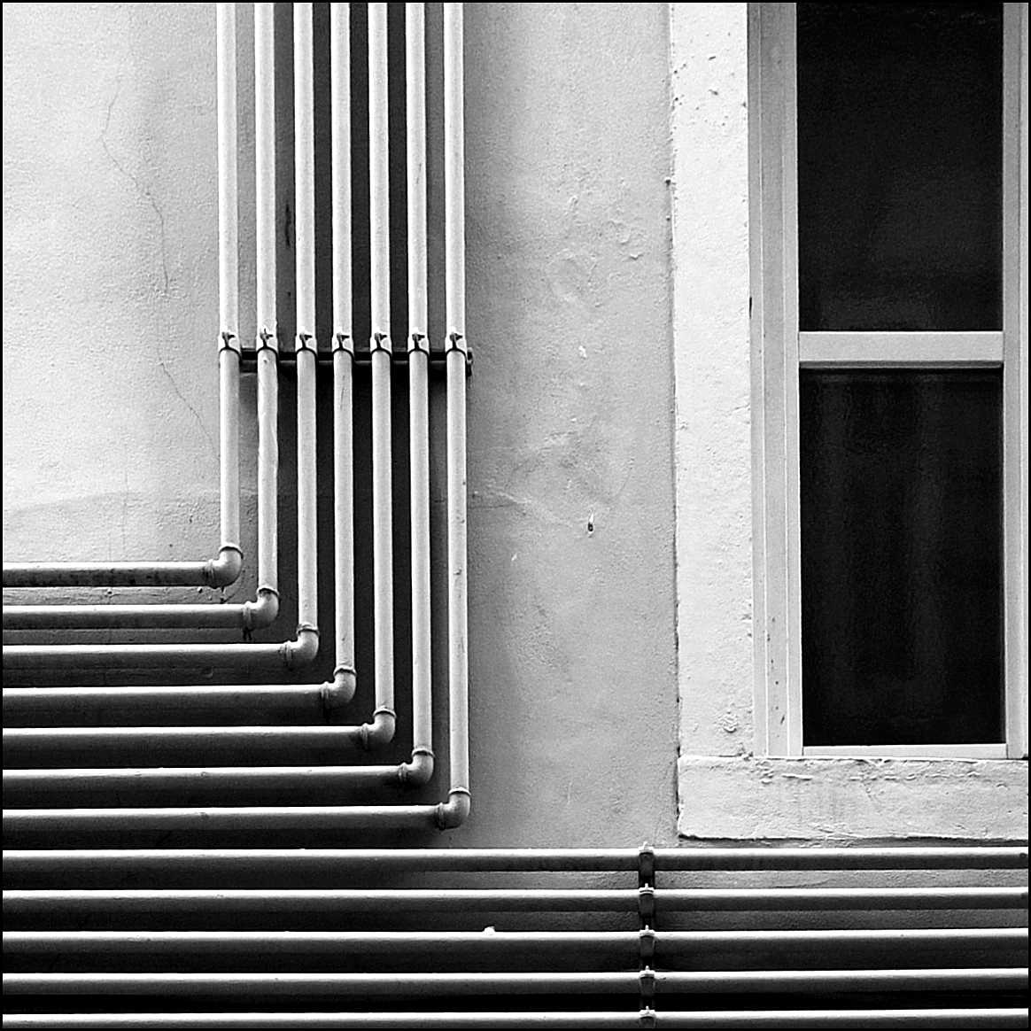 | L'uso del bianco e nero ed il contrasto elevato tra il bianco brillante dei tubi e della finestra ed il grigio del muro esalta il pattern e conferisce all'immagine una componente grafica bidimensionale nonostante la profondità suggerita dalle curve delle tubature.....ottima per me. Ciao Gianni. |