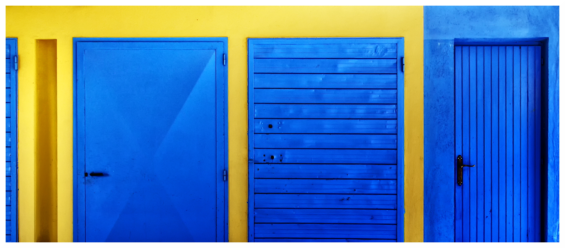 Il fulcro dell'immagine risiede nel contrasto cromatico netto tra il blu elettrico delle porte e il giallo brillante delle pareti. Questi due colori primari, posti uno accanto all'altro, creano una tensione visiva immediata. Il giallo funge da sfondo mentre il blu delle porte definisce il soggetto. Non condivido il taglio in basso che sembra mozzare la composizione...ma se hai fatto questa scelta ci sarà un buona motivazione..... un saluto Gianni .
