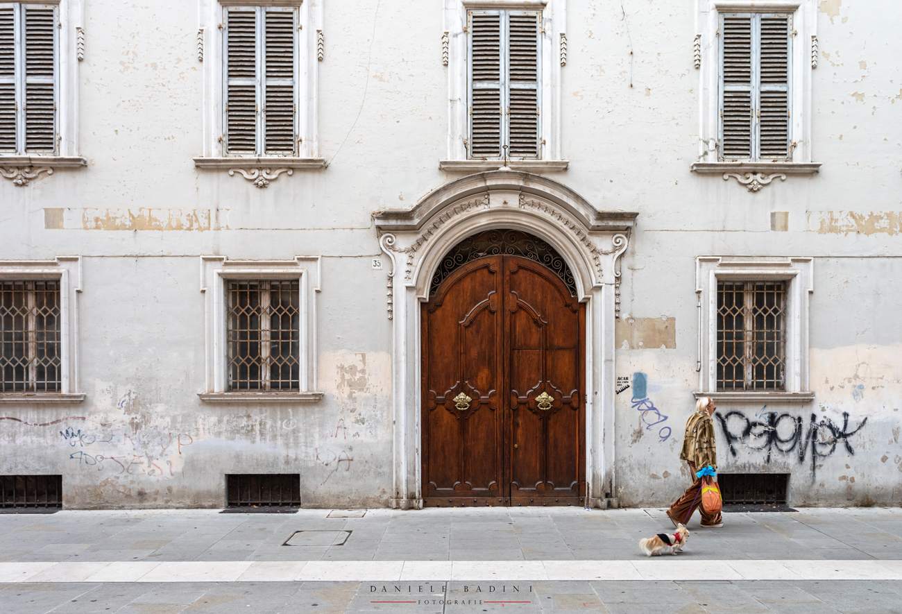Il portone da solo meriterebbe la foto e un commento, c'è un leggero ''deragliamento'' verso a sinistra, sempre lì avrei decisamente tagliato le mezze finestre per ottenere una simmetria praticamente perfetta; è un genere che come sai trovo molto gradevole  |