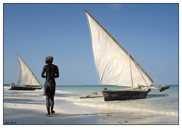 Bella composizione; la figura umana (centrale nel discorso, ma opportunamente decentrata) è accompagnata e contrapposta dalle due barche (dovrei dire vele) che la bilanciano!