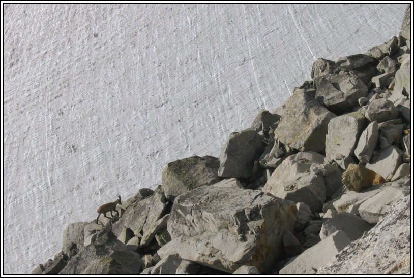 | Uno stambecco cerca una via tra i massi del Chüebodenhorn... sullo sfondo una lingua di ghiacciaio... |