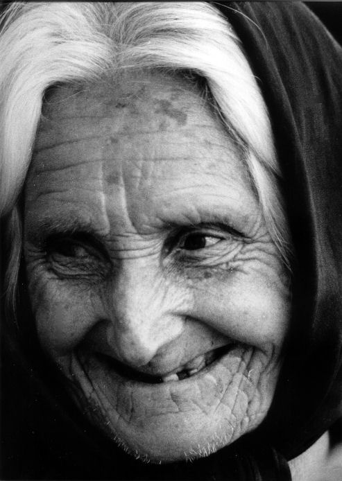 il sorriso dell'anziana signora comunica un momento di allegria, momenti che spesso mancano nella loro vita.
