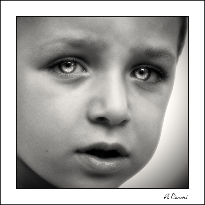 Intanto sono partito da uno scatto in RAW, ho desaturato regolando poi le tonalità del B&N con livelli e curve. Ho portato gli occhi su un livello a parte e ne ho curato la resa con le curve ed un pò di contrasto.