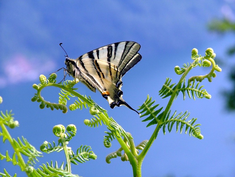 Si tratta della non comune farfalla Iphiclides podalirius. La difficoltà della foto è stata (come sempre del resto) la pazienza! Infatti prima di riuscire a fotografarla quasi controsole su una felce aquilina in quella posizione ho dovuto pazientare più di 40 minuti. Ma alla fine ci sono riuscito.