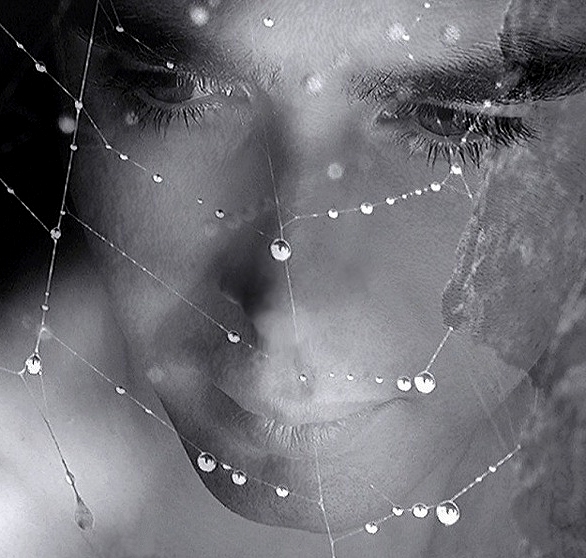 immagine suggestiva, il volto di un uomo intrappolato dietro una ragnatela coperta di rugiada....ma la "macchia" sulla destra? cosa è?