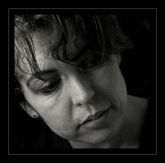 It seems that you was trying to have a cut that could become an hypnotic look. The pose talks about million thoughts, and the beautiful light helps this. The dark side of the face talk to me about dark corner in the mind. I think that all these things, with a beautiful b/w let your photo be full of meanings.
