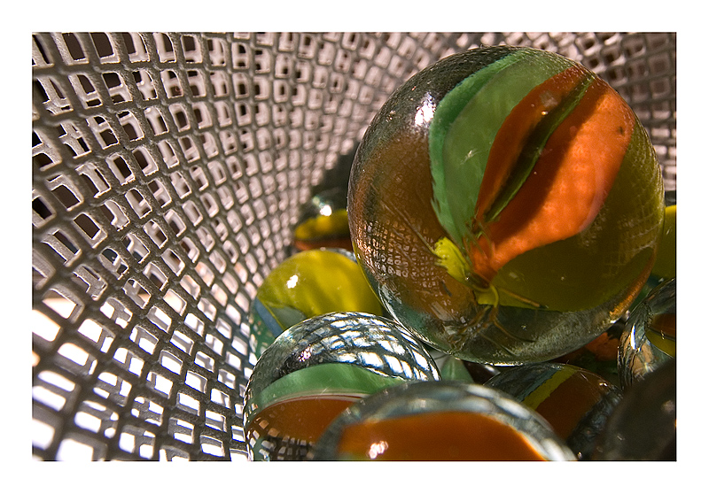 BeSecondo me lo sfondo disturba troppo.....andrebbe un tantinello smorzato.sfocato....ma le biglie sono fantastiche.