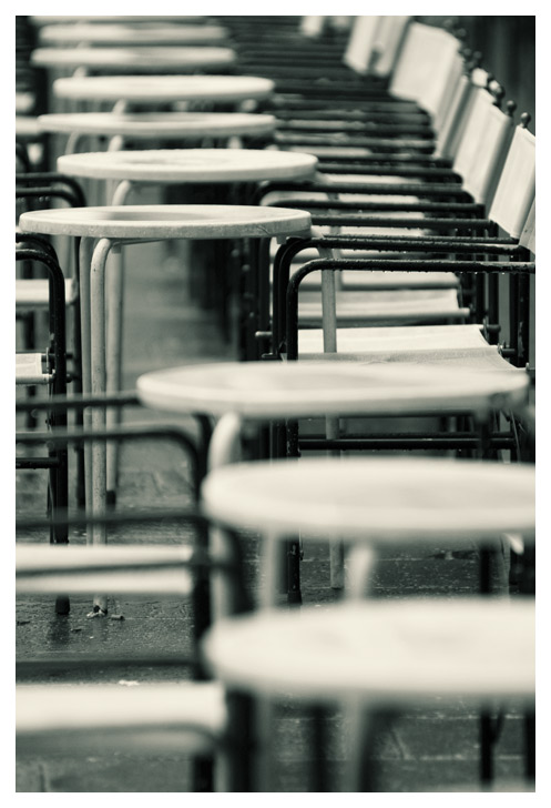 a parte il discorso della pioggia e del titolo, trovo molto interessante questa ripetizione ciclica di tavolini e sedie. Bello anche il b/n con questa dominante azzurro/verdina!  _________________