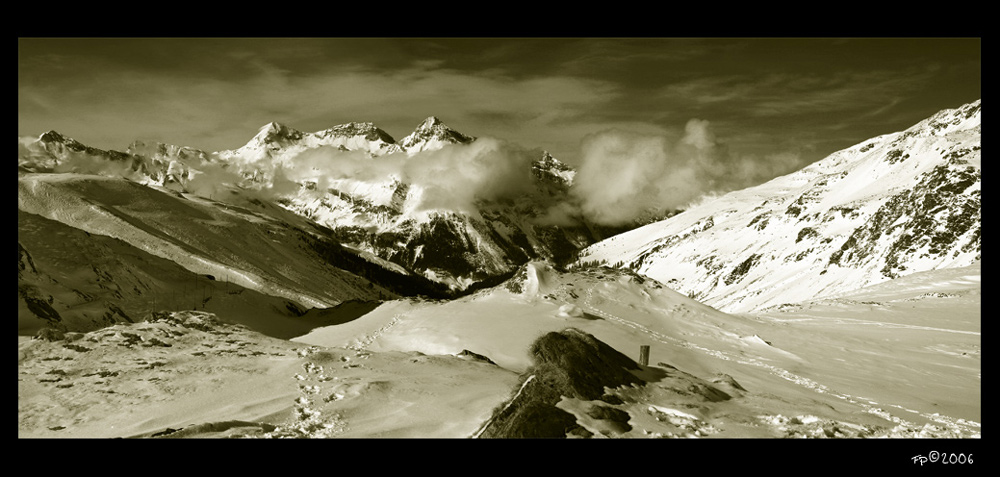 Come Argovia, anche io non sono molto favorevole ai viraggi. Tuttavia devo dire che in questo caso conferisce un senso di drammaticità all'immagine, con il cielo nero che incombe sulle vette. Buona anche la composizione!  _________________ Si fa presto a dire che tutti abbiamo una memoria fotografica!
