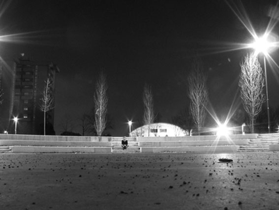 Avrei giocato sulla simmetria per renderla ancora più alienante, ovvero la figura umana esattamente al centro e la luce di sinistra inclusa come quella di destra.