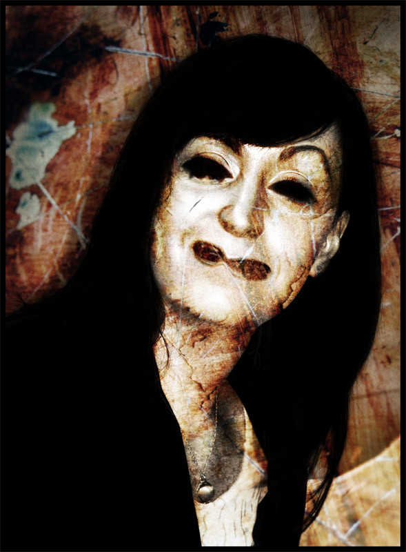 Un lavoro eccezionalmente bello da una foto casalinga. Il timbro che hai usato per la pelle è agghiacciante e lo sfondo inquietante. La mancanza degli occhi e la distorsione oculata del sopracciglio ne fanno un'essere "vuoto", quasi un simulacro, un recipiente per un essere che non c'è.