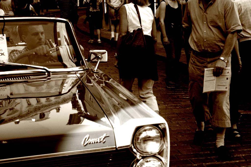 Hai sicuramente smanettato un pò con photoshop, e il risultato non mi dispiace; così come non mi dispiace questo taglio stretto e rubato della folla, dove il volto del guidatore la fa da padrone, mentre osserva distrattamente i passanti.