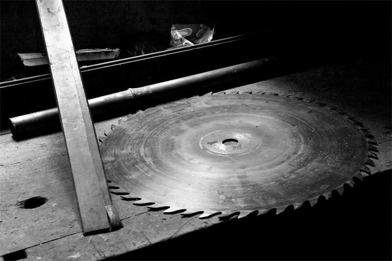 Mi piace il gioco della luce, con forti zone nere e la sega circolare ben illuminata. E' una foto abbastanza grafica, che suggerisce il lavoro di un carpentiere o falegname con pochi elementi ben disposti. La trovo gradevole, anche per il buon b&n.