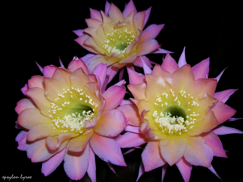 Questi sono come imbuti lunghi circa 25cm con un diametro di almeno 10cm, sbocciano al calare della notte e durano pochissimo (fino a pranzo del giorno seguente), nascono da una varietà echinopsis...