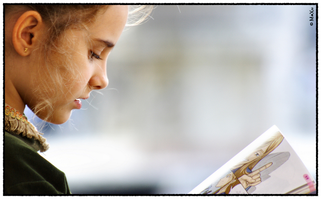 Bella l'attenzione e la compostezza della bimba davanti ad una lettura presumibilmente infantile (se non sbaglio sta leggendo un fumetto)...da come é abbigliata, dalla pettinatura, dal riflesso dorato sui capelli, sembra quasi una raffigurazione d'altri tempi di una giovane intenta a leggere poesie del Dolce Stil Novo.