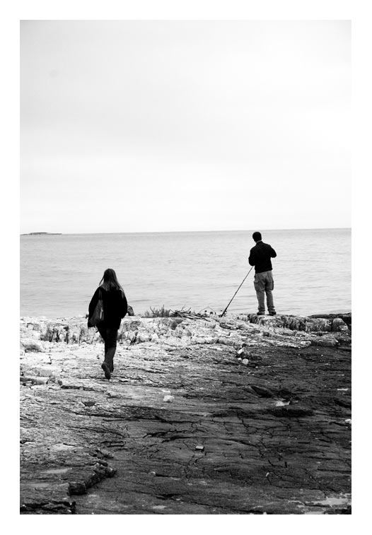 Il b/n è bilanciato e contrastato alla perfezione, il paesaggio è suggestivo...ma non sta succedendo niente di particolare ...il ragazzo sta fermo impalato non si capisce a che fare, sembra che stia facendo la punta a una stecca da bliardo, la ragazza cammina...non c'è il mare mosso...per cui alla fine manca qualcosa che renda interessante la foto