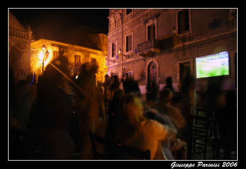 In questa foto invece, si rappresenta un angolino di una tranquilla piazza di un paesino siciliano, dove pochi intimi, si sono riuniti davanti ad un maxi televisore, forse messo a disposizione da uno di loro, portandosi la sedia da casa, per far tifo alla nazionale italiana.