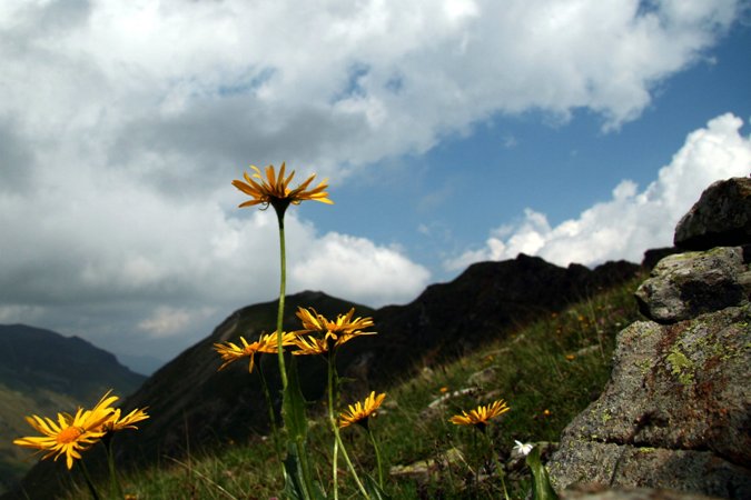 Avrei optato per un punto di ripresa più basso e un taglio verticale includendo tutto il gambo dei fiori ed escludendo il fiore giallo e bianco sulla destra.