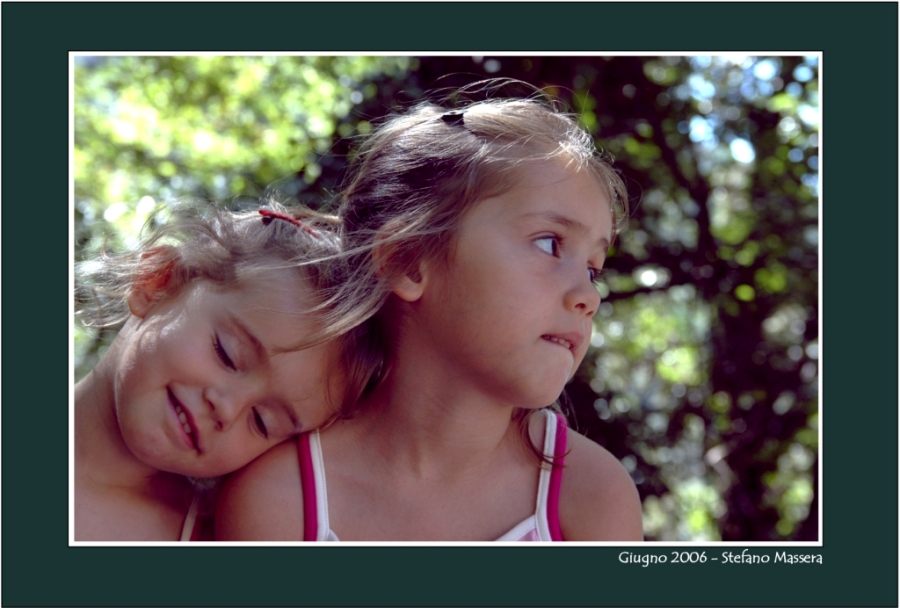 Affetto e delcezza tra due belle bimbe. Gradevoli espressioni, diverse nei pensieri che passano per la testa. Luce in ombra ben calibrata e belli i raggi tra i capelli. Il taglio, a mio avviso, doveva essere spostato più a sx. Così com'è andrebbe bene per la sola bambina al centro. Ciao
