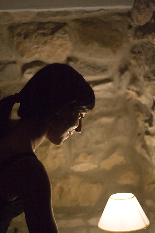 si sono d'accordo con sopra. l'immagine mi dà un senso di meditazione. Forse il soggetto dovrebbe essere serio, ma non arrabbiato. Anche io avrei dato un po' più di respiro alla lampada e al braccio, evitando il soffitto in pietra. Sarebbe bello forse giocare anche con la sottoesposizione, se la luce della lampada non è troppo debole, ma sembra che non lo sia.