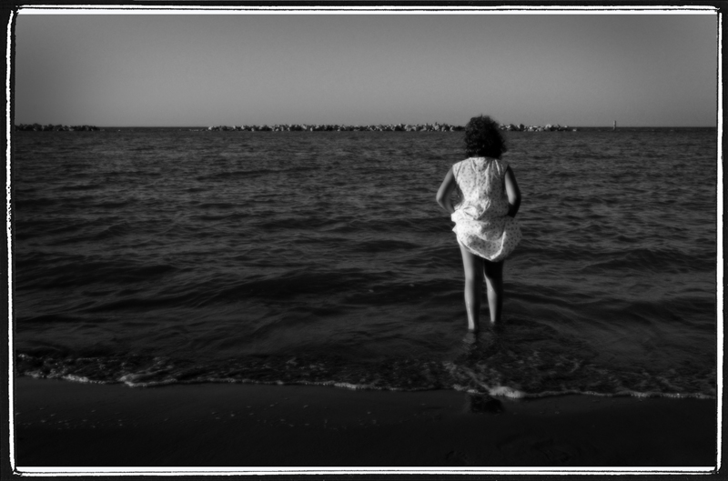 A questo contribuisce la ragazza, che ricorda vagamente tempi in cui le donne al mare potevano presentarsi solo piuttosto coperte. In questo senso trovo comunque bello, e in una certa misura anche sensuale, il gesto di sollevarsi la gonna ed entrare nell'acqua in questa maniera.