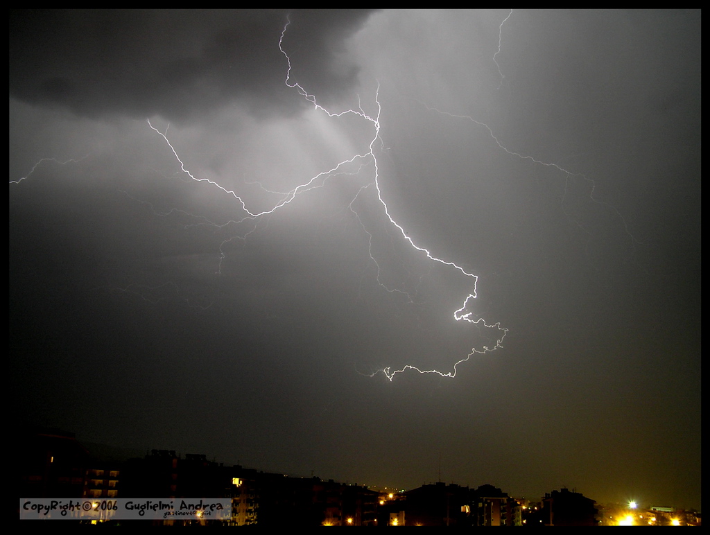 Ho piazzato sul davanzale l'Olympus con cavalletto.. fondamentale è impostare il tempo minimo sugli 8 secondi.. si calcola più o meno il momento in cui si pensa arriverà il fulmine.. si schiaccia e gli 8 secondi (che possono poi essere anche 10 o 12) lasciano tempo a sufficienza per sperare che nel frattempo arrivi qualche bel gesto di forza da parte di Madre Natura!! Si valuta il risultato e si interagisce sugli altri settaggi che sono in fondo molto influenzati dall'inquinamento luminoso della zona in cui si fa la foto..