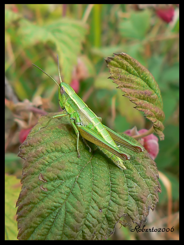 buona composizione, probabilmente la foglia in p.piano ti ha fregato la messa a fuoco sulla cavalletta!