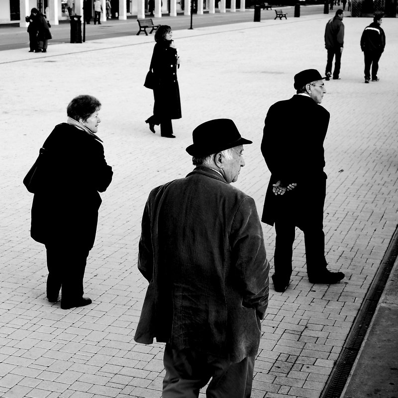 Oltre ad un bn perfetto ed ad un' espressività eccellente di tutti i personaggi, hai colto i primi due signori vestiti in un modo che può far apparire la foto anche + vecchia di quello che è . Poi invece salendo con lo sguardo la striscia bianca sul giubbotto del ragazzo e le scarpe da ginnastica ci riportano hai giorni d' oggi.