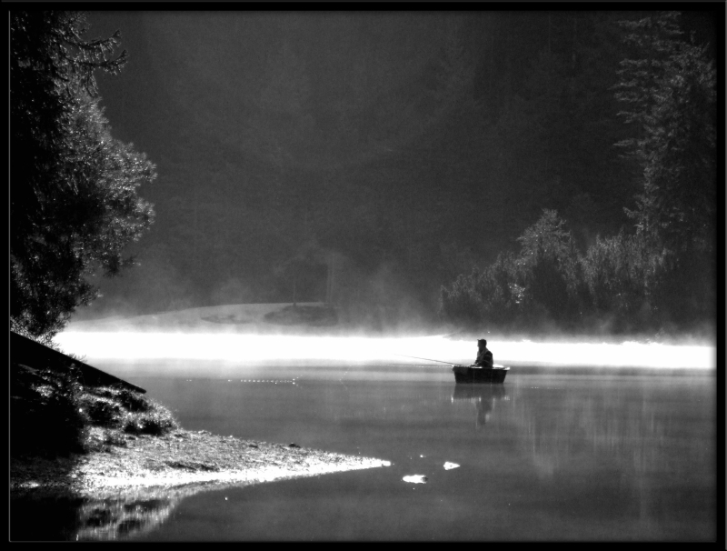 la nebbia dietro al pescatore (la striscia bianca) ha creato qualche problema al sensore perchè colpita direttamente dalla luce del sole: il bosco dietro infatti (ben visibile a colori) è risultato un po' rumoroso