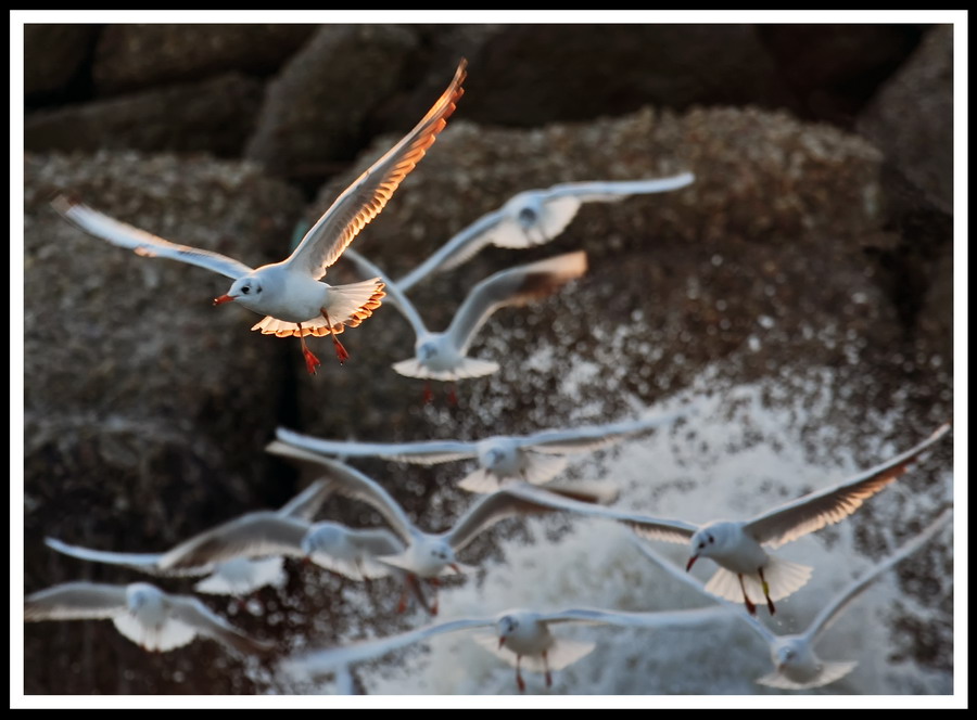 Hai fatto bene ad andarla a "ripescare"...il fotogramma pieno, il sole riflesso sull'ala e sulla coda del gabbiano in primo piano, estremamente nitido, gli spruzzi dell'onda che si è appena infranta sullo scoglio.....bravo!