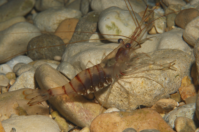 Esemplare femminile di Palemone, gamberetto comunissimo ma estremamente bello (parere personale), con in trasparenza la massa di uova scure sotto l'addome. Foto di una difficoltà paurosa per via della risacca e delaa corrente, era come scattare sul tagadà.