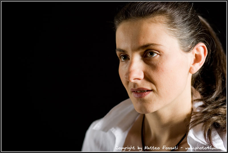 | Bel ritratto e bel taglio. Secondo me sarebbe stato meglio spostare la luce di destra più verso il dietro della ragazza per creare un profilo di luce sui capelli (di solito è bellissimo) e sarebbe bruciata di meno la parte destra del viso (è proprio al limite)... bravo! |