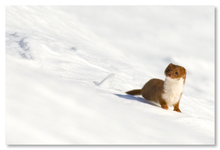 Composta magistralmente.....il corpo della donnola lo vedo però leggermente sovraesposto. Una regolatina con parsimonia ai livelli e salvi capra e cavoli, come dire neve e donnola.