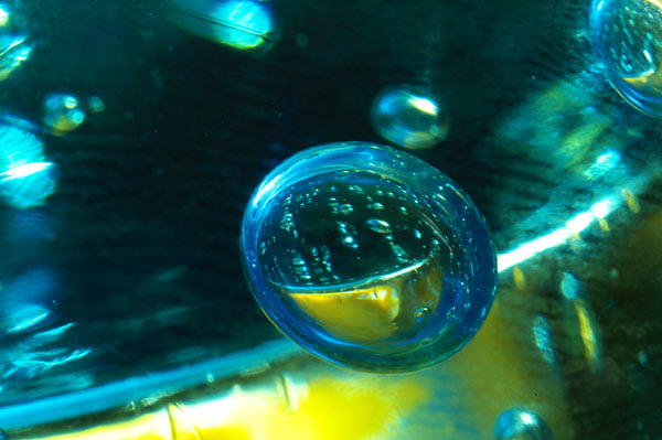 Uno di quei posacenere di vetro con dentro intrappolate bollicine d'aria contenente dei piccoli pezzi di carta gialla e fotografata con tubi prolunga (56 mm su obiettivo 50 mm). _________________ --