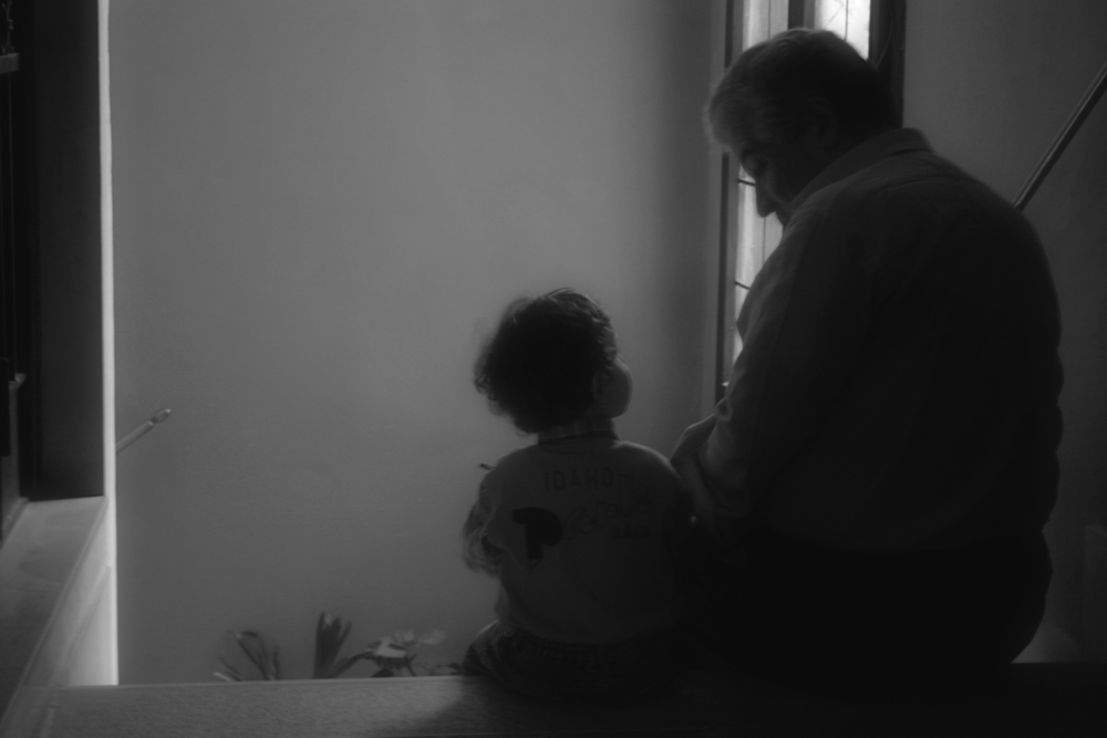 mio padre e mio nipote erano seduti fuori dalla porta di casa ed io ho dovuto fare una corsa per recuperare la macchina e catturare il momento visto che, pochi istanti dopo la foto, è spuntato mio fratello da diertro l'angolo e Valentino è saltato subito addosso al papà... da cui il mosso...