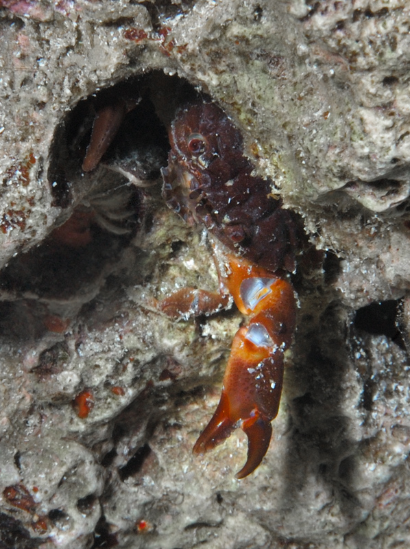 Granchio che faceva capolino da una fessura agitando una chela quasi per saluto.