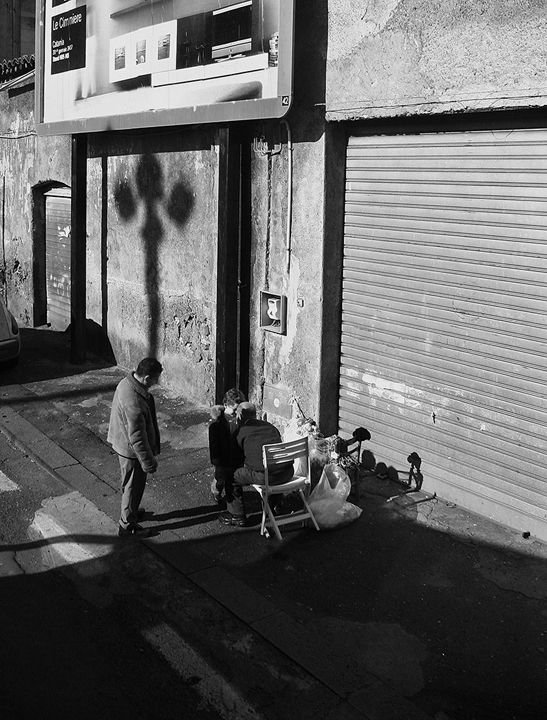 Io incontro qualche difficoltà di lettura della scena (a meno che il motivo che ha giustificato lo scatto sia stato sfruttare la sovrapposizione tra l'ombra ed il personaggio in piedi .. ma non credo). Forse il formato non aiuta o la distanza dai protagonisti era eccessiva e non consente di cogliere immediatamente quello che sta accadendo (avvicinarsi in questi casi è consigliabile).