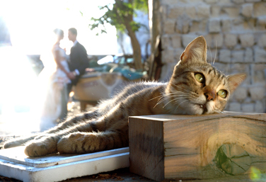 Il soggetto sembra a fuoco e sembra essere il gatto ma l'occhio viene colpito dalla eccessiva luce e va a cercare cos'è che lo infastidisce. Lì trova la coppia (di sposi?) che forse si rivela il soggetto principale.
