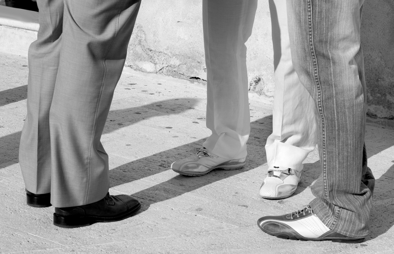 A parte quesata divagazione tra il serio e il giocoso, la foto non la trovo malvagia, l'idea nemmeno. Non so mi ricorda gli uomini siciliano nella piazza di paese. Ambientata adesso ma con "scarpe d'altri temp"i. Come diceva Nanni moretti in Bianca le scarpe rivelano l'anima di chi le indossa.