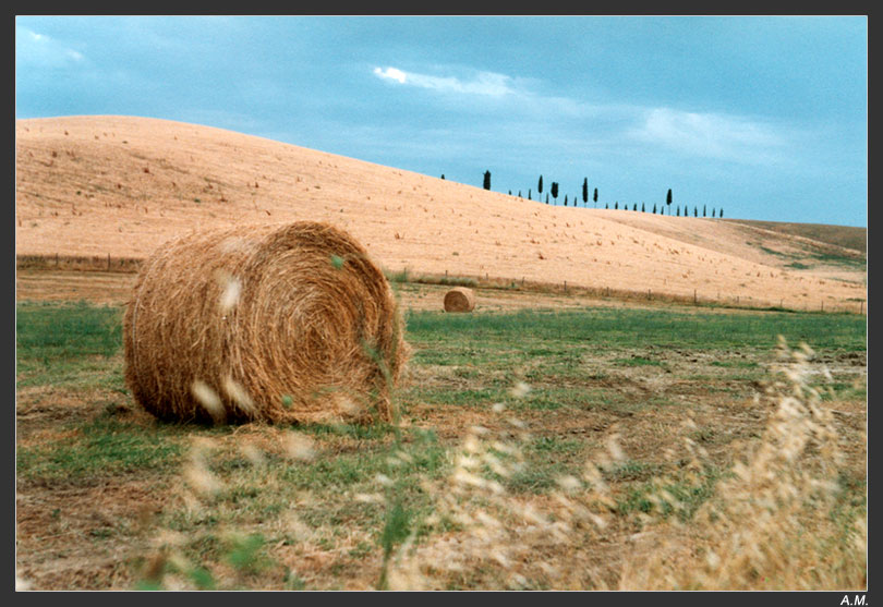 Una delle mie colline preferite, in un giorno di cielo cupo. Spero che i colori rendano e non siano slavati, è una scansione.